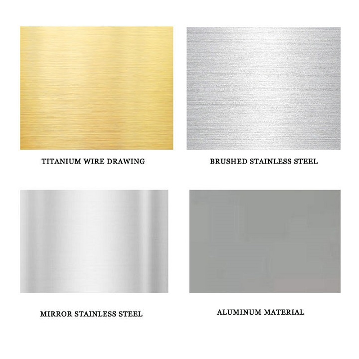 | Aluminio | Latón | Acero inoxidable cepillado | Espejo de acero inoxidable. | |